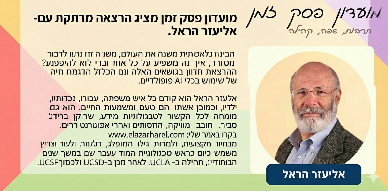 The lecture will discuss these topics and will include a live demonstration of popular AI tools. Elazar Harel is, first and foremost, a family man—a husband, grandfather, and father; naturally, his wife is the spice and meaning of his life. He is also an expert in all things related to information technology, a decent bridge player, a music lover, and an avid reader. Over the last two years, he has become "addicted" to everything related to AI and greatly enjoys learning and teaching about both the wonderful possibilities and the dangerous aspects of this technology.