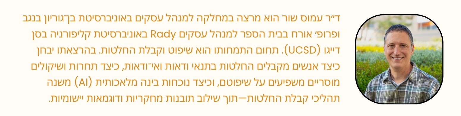 Dr. Amos Schurr is a lecturer in the Department of Business Administration at Ben-Gurion University of the Negev and a visiting professor at the Rady School of Management at the University of California, San Diego (UCSD). His area of expertise is judgment and decision-making. In his lecture, he will examine how people make decisions under conditions of certainty and uncertainty, how competition and moral considerations influence their judgment, and how the presence of artificial intelligence (AI) is changing decision-making processes—drawing on research insights and practical examples.